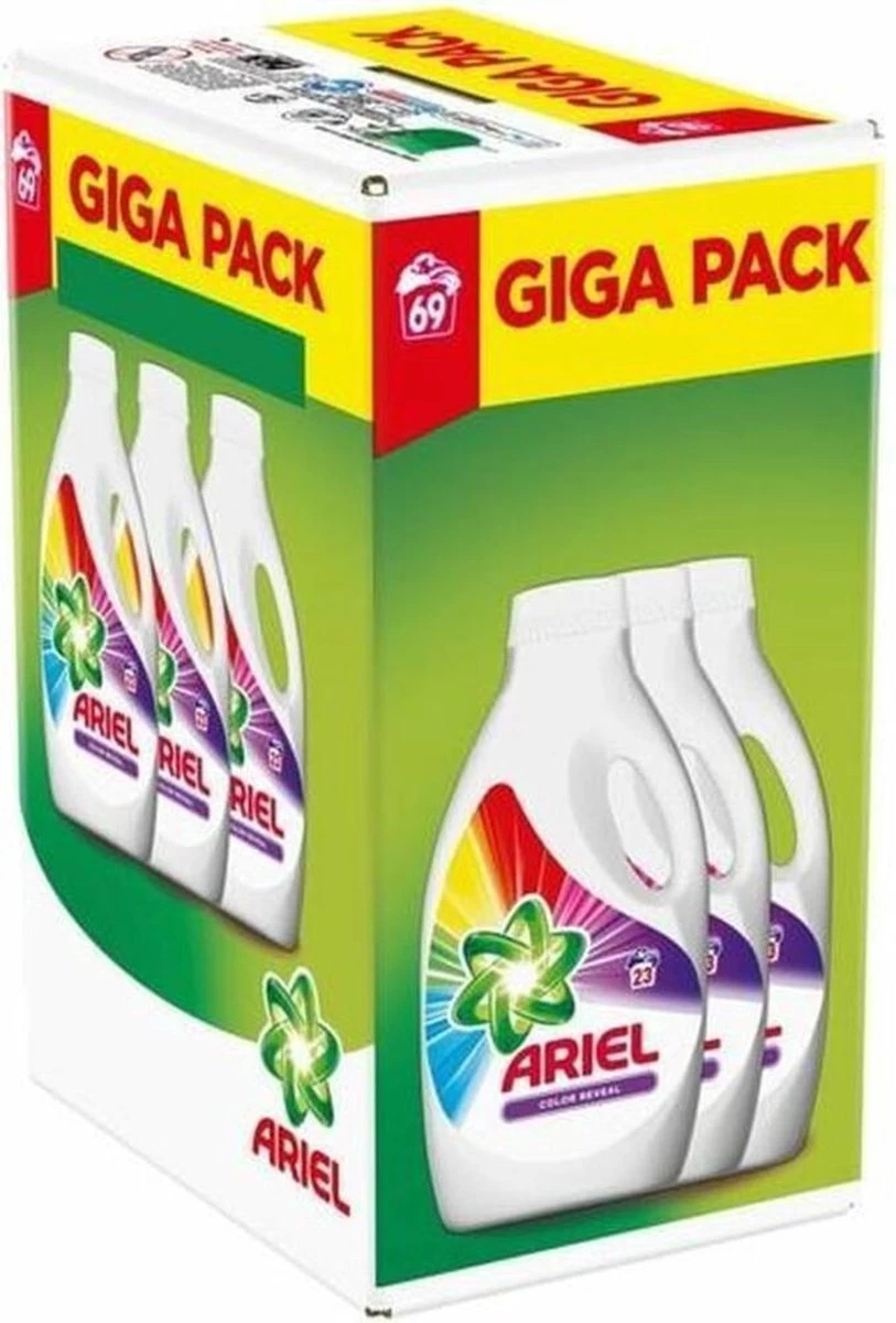 In dit pak zitten drie flessen wasmiddel. Deze zijn goed voor in totaal 69 wasbeurten.