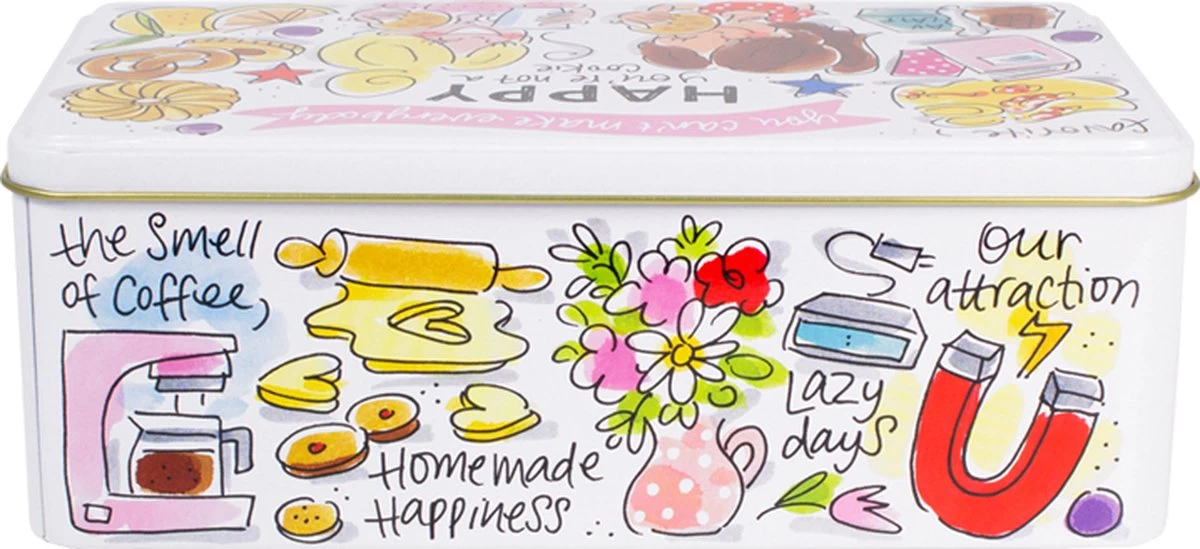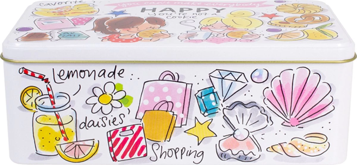 This make me happy! Dit vrolijke (koek)blik, maakt jouw tafel nog gezelliger! De opvallende en kleurrijke illustraties zijn in het thema Happy ontworpen. Op het blik staan allemaal grappige quotes die jou blij maken. Zoals op dit blik met de tekst: “You can’t make everybody happy” en You’re not like a cookie! Het blik is leuk te combineren met de andere nieuwe Happy items.