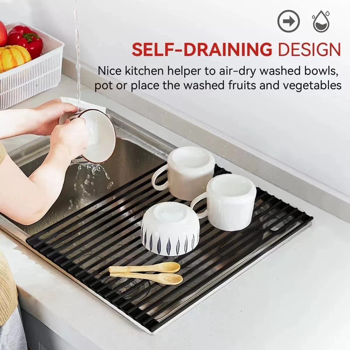 All-In-One Over The Sink Drying Rack: Multifunctioneel keukenmateriaal – schotel droogrek, onderzetter, warmte-isolatiemat, vergiet, voorbereidingsruimte, afvoer van overbewaterde bloempotten – alles in één! Dit opklapbare afdruiprek kan niet alleen worden gebruikt als afdruiprek voor het aan de lucht drogen van keukengerei, zoals afgewassen kommen, pannen, glazen, kopjes, platen, kookgerei, bestek, steelpan, mokken; maar ook als een groente vergiet voor het wassen van fruit en groenten met oprolbaar afdruiprek boven de gootsteen keuken.