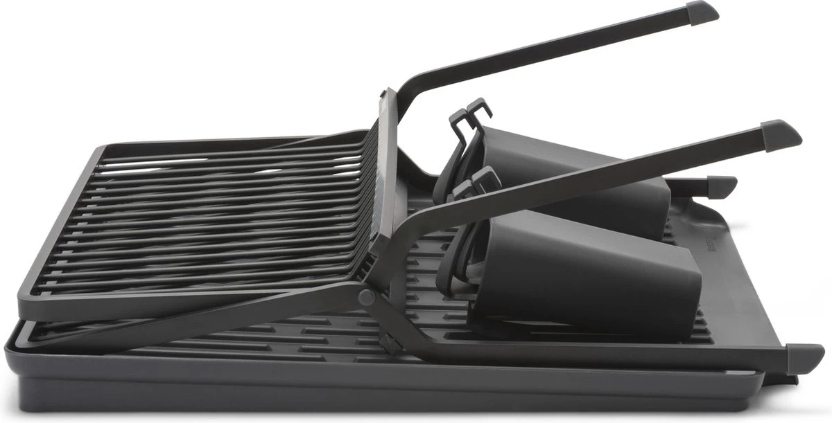 Op dit inklapbare Brabantia Sink Side Afdruiprek – Dark Grey met lekbak kun je al je borden, pannen en glazen kwijt – zelfs je breekbare wijnglazen. De bakjes voor bestek en keukengerei zijn afneembaar. Handig voor transport en bij het inklappen en opruimen van het rek. Een lekker rek dus, mooi genoeg om op je aanrecht te laten staan, maar ook makkelijk en klein op te bergen.