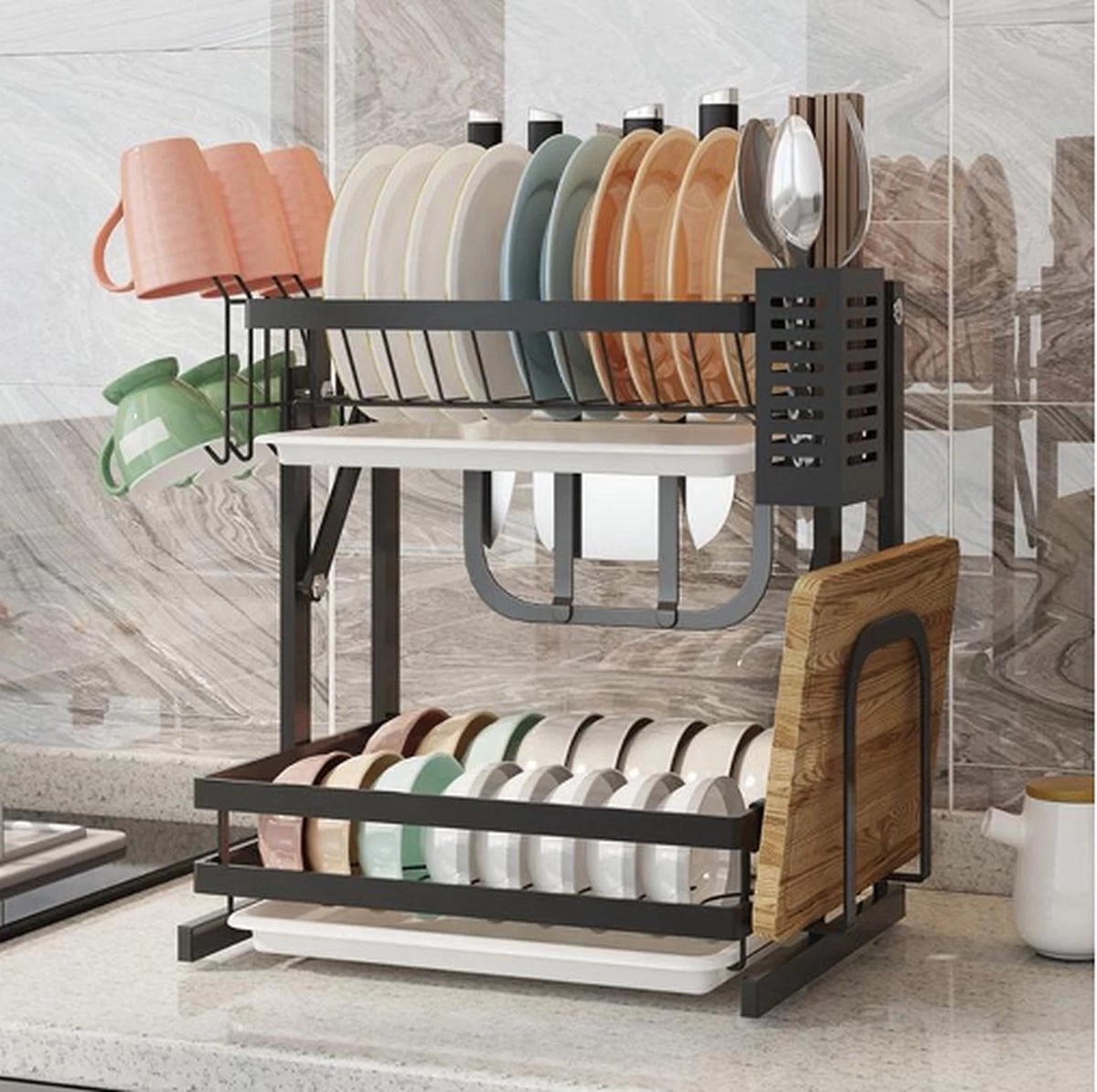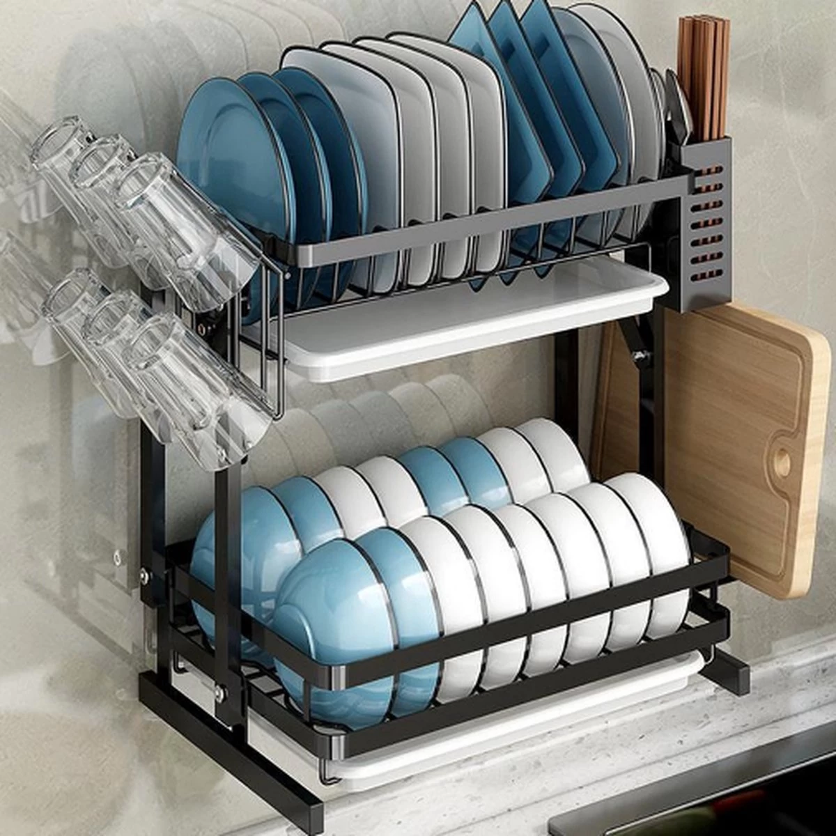 - Schotelopslag: ontwerpen voor borden, kommen, kopjes, zijhouder voor keukengerei, de ene kant is uitgerust met een afdruiprek en de andere kant heeft een bestekmand om te drogen, ideaal voor het drogen van keukengerei, houdt de keuken tegen rommel