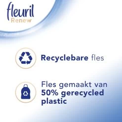 Fleuril wasmiddel zorgt voor je kleding & voor de planeet: De wasmiddel formule bestaat uit ingrediënten waarvan meer dan 90% een natuurlijke oorsprong heeft*. De fles is gemaakt van 50% gerecycled plastic en is 100% recyclebaar. Het is belangrijk om de wasvoorschriften in uw kleding te volgen voor het beste wasresultaat.