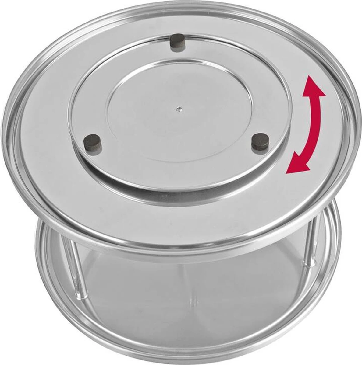 De kastrondel dubbele dekker is een echt opruimingswonder. Met zijn twee legplanken die 360 graden kunnen worden gedraaid biedt het slimme ruimtebesparende rek in een handomdraai flexibele opbergruimte die op verschillende manieren kan worden gebruikt. En het kan gebruikt worden waar je het nodig hebt. De draaimolen demonstreert zijn opruimtalent onder andere in het keukenkastje. Hier kan het roestvrijstalen draaiplateau worden gebruikt om bakingrediënten specerijen glazen en ander keukengerei te organiseren. Dankzij het dubbeldeks rek is het niet langer nodig de ladder op te klimmen om het meel helemaal achteraan in de kast te bereiken. In plaats daarvan volstaat een snelle draai aan het desbetreffende rek en het gewenste ingrediënt is binnen handbereik – zonder klimmen of rekken.