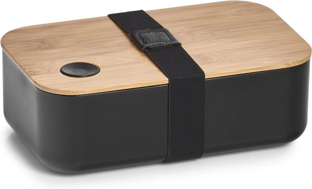 Lunchtrommel/lunchbox/broodtrommel met scheiding zwart/naturel 19 x 7 cm. Deze lunchtrommel is geschikt voor zowel warm als koud voedsel. De deksel is gemaakt van duurzaam bamboe en bevat een siliconen ring voor goede sluiting, met extra elastieken band. De inhoud van de trommel is van elkaar te scheiden, bijvoorbeeld brood en groente/fruit, door een bijgeleverde verdeler. Afmeting: ca. 19 x 12 x 7 cm. Materiaal: kunststof/bamboe. Vriezergeschikt: ja. Magnetrongeschikt: ja, niet de deksel. Vaatwassergeschikt: ja, niet de deksel. Keukenbenodigdheden – Lunch/brood meenemen – Trommels/boxen voor warm en koud voedsel.