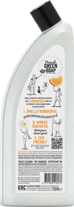 Marcel’s Green Soap toiletreiniger sinaasappel & jasmijn is gemaakt met natuurlijke ingrediënten, minstens 97% biologisch afbreekbaar en komt in een fles van 100% gerecycled plastic. Lekker duurzaam de pot op je zou ‘m bijna over het hoofd zien omdat ‘ie zo klein is – maar ook op het kleinste kamertje in huis valt winst te behalen. Veel reguliere schoonmaakmiddelen zoals toiletreiniger bevatten namelijk schadelijke stoffen voor het milieu. Daarnaast leveren ze ook nog eens een berg afval op. Niet nodig. Kies daarom voor de duurzame toiletreiniger en het duurzame toiletblok van marcel’s green soap, en maak van het kleinste kamertje in huis ook het groenste kamertje! duurzame toiletreiniger zoals alle producten van marcel’s green soap, bevat onze toiletreiniger geen kleurstoffen, parabenen, fosfaten, chloor, ammonia of zuren. Wél zit ‘ie bomvol natuurlijke ingrediënten, en is de toiletreiniger minstens 97% biologisch afbreekbaar. Hiermee is de toiletreiniger veilig te gebruiken, ook wanneer je een septic tank hebt. Sinaasappel & jasmijn jasmijn heeft een mysterieuze, bedwelmende toon, en schijnt ook een romantisch afrodisiacum te zijn. Als dat jouw relatie met schoonmaken niet versterkt! gelukkig voegt de sinaasappel hier de nodige nuchterheid en frisheid aan toe. We zijn hier tenslotte wel om schoon te maken…