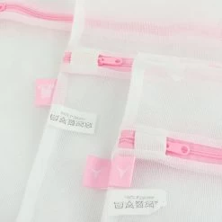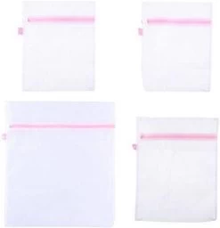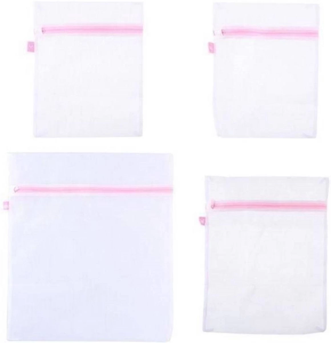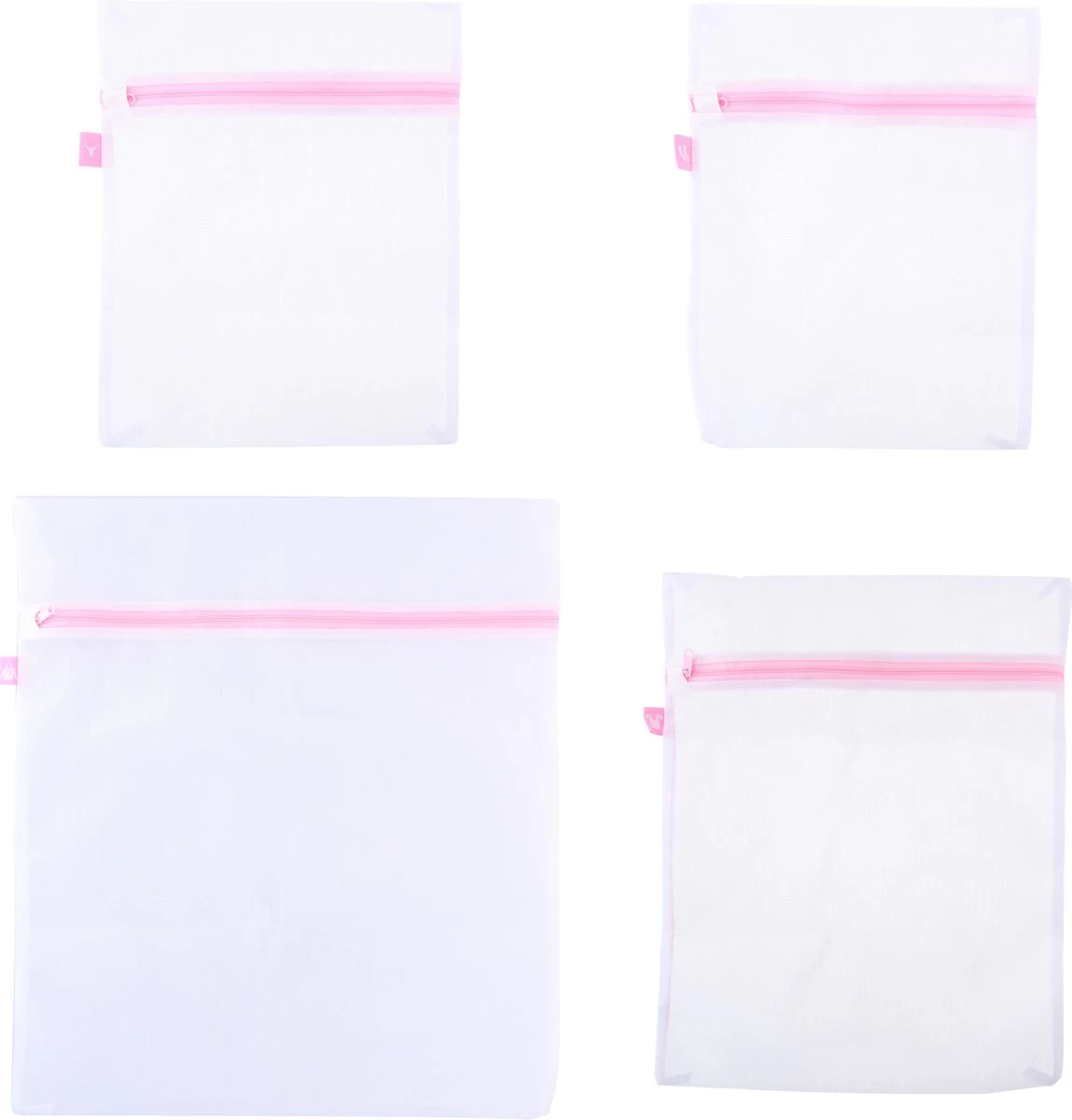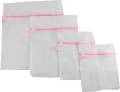 Set van 4x stuks waszakjes/wasnetjes wit/roze in 3 formaten. Deze waszakjes beschermem klein wasgoed, zoals bh’s of panty’s tijdens het wassen en centrifugeren. Voorzien van een rits sluiting. Afmetingen: ca. 46 x 50 cm, 34 x 43 cm en 26 x 33 cm. Materiaal: polyester.