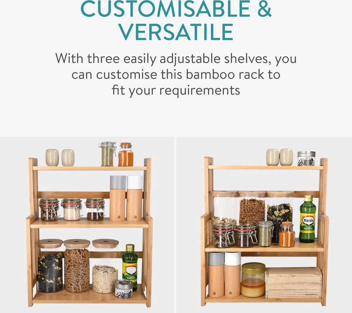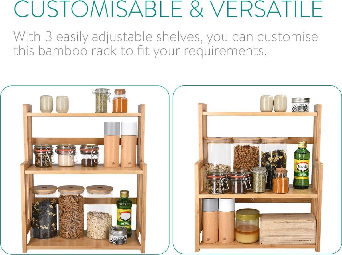 - HELPT JE ORGANISEREN: Rangschik je oliën, specerijen en kruiden met dit keukenrek van natuurlijk bamboehout. Met dit drielaagse staande kruidenrek is je keuken meteen weer netjes en opgeruimd.