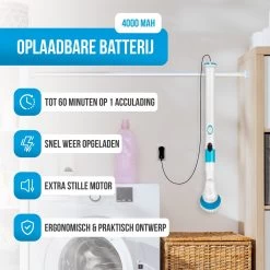 Erg fijn aan de elektrische schoonmaakborstel, is dat hij draadloos is. Hierdoor neem je de roterende schrobmachine eenvoudig overal mee naartoe. De 4000mAh schoonmaakborstel is binnen 3 uur volledig opgeladen, waarna deze tot wel 60 minuten meegaat.