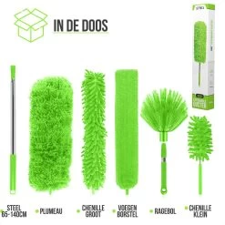 De set bestaat uit 5 verschillende schoonmaak tools. Een uitschuifbare houder, een grote microvezel-stofborstel, een grote chenille-stofborstel, een kleine chenille-stofborstel, een ragebol en een voegenborstel. Perfect voor het reinigen van ventilatieroosters, plafondventilators, hoge plafonds, jaloezieën, banken of andere moeilijk bereikbare plaatsen.